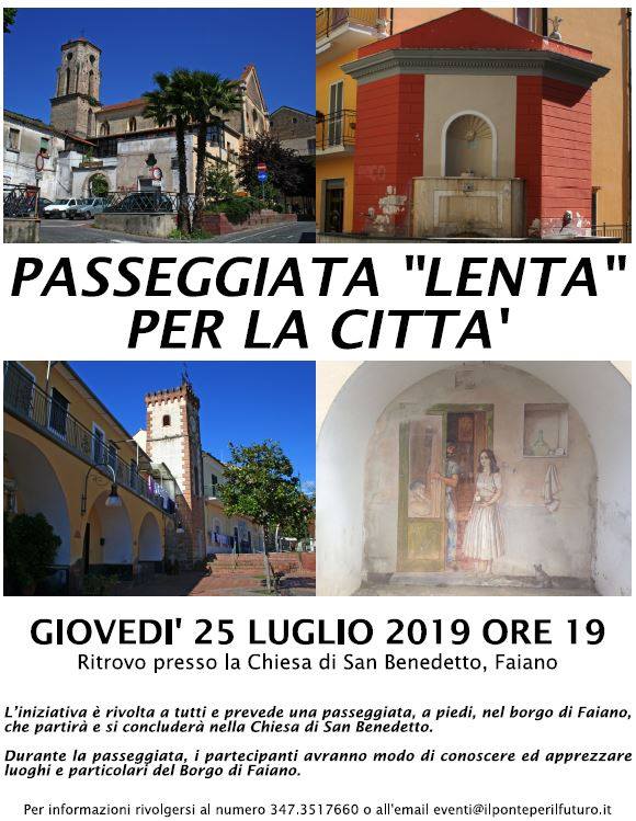 Ritorna la passeggiata "lenta", a piedi, per il Borgo di Faiano, partendo dalla Chiesa di San Benedetto e concludendola nello stesso posto, dopo aver giro-vagato per Faiano. Ci ritroviamo a San Benedetto alle 19